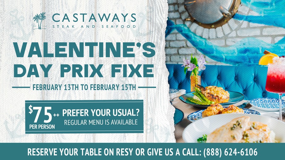 Celebrate Valentine’s Day at Castaways with our Valentine’s Day Prix Fixe, available February 13th through February 15th. Enjoy a special multi course menu for $75++ per person in a cozy, waterfront setting.